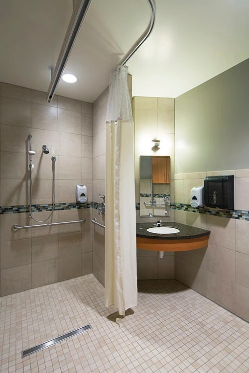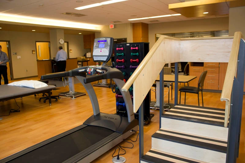 Central to all patient rooms, the large therapy gym faces an interior courtyard, allowing patients to take their sessions outside while flooding the space with natural light and warmth. Therapy kitchens and bathrooms ready patients for their transition back home while open teaming work rooms permit staff to interact with patients and each other more consistently throughout the day.
